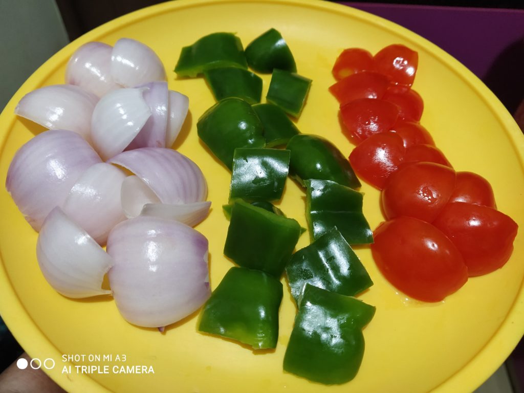 - Add diced onion, tomato and capsicum dices and marinade them well with the spice mix